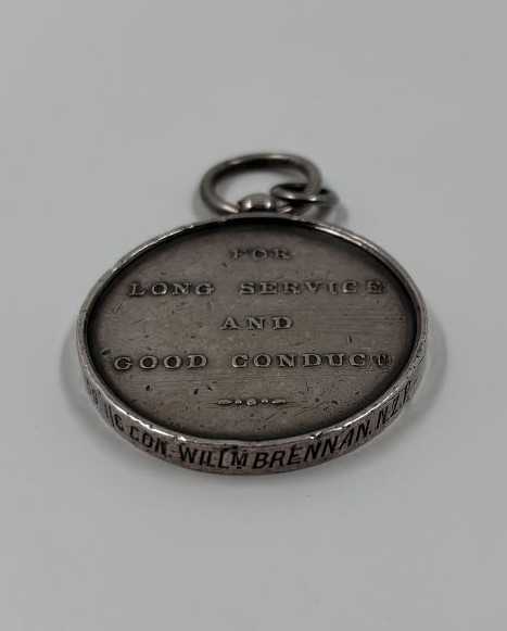 A medal engraved “Con. Willm BRENNAN N.Z.P for long service and good conduct” honours one of Cambridge’s earliest police officers, William Brennan. Brennan patrolled the town between 1876 to 1897.