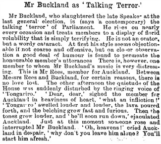 Buckland was MP for Franklin North in 1884-1887 and for Manukau in 1890-1893. In the House, he became known as the “most satirical wag” who had ever sat in Parliament.