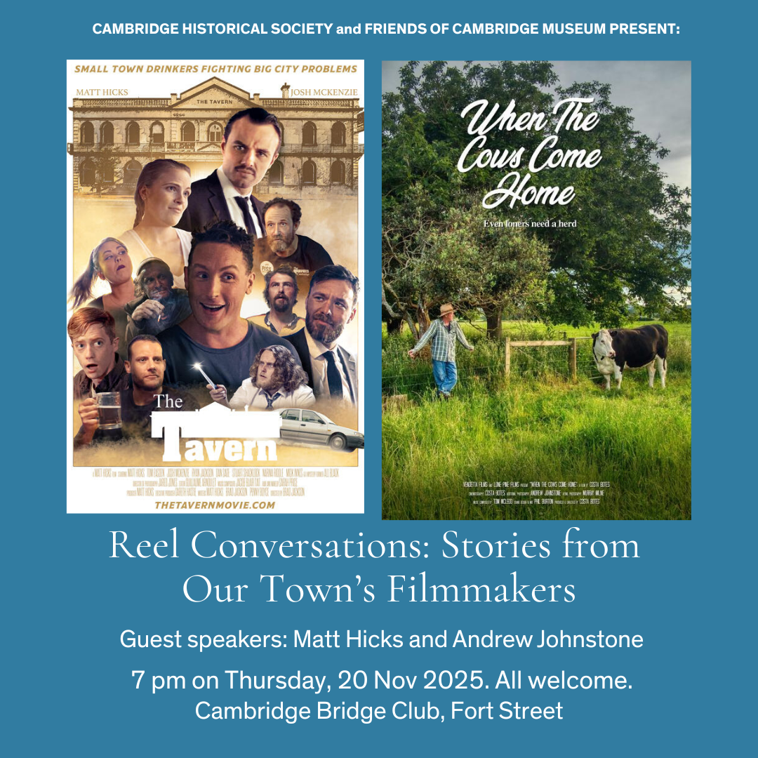 Join the Cambridge Historical Society for a short AGM and a special evening with local filmmakers Matt Hicks (The Tavern) and Andrew Johnstone (When the Cows Come Home). From town streets to Fencourt paddocks, discover how Cambridge has been captured on screen.